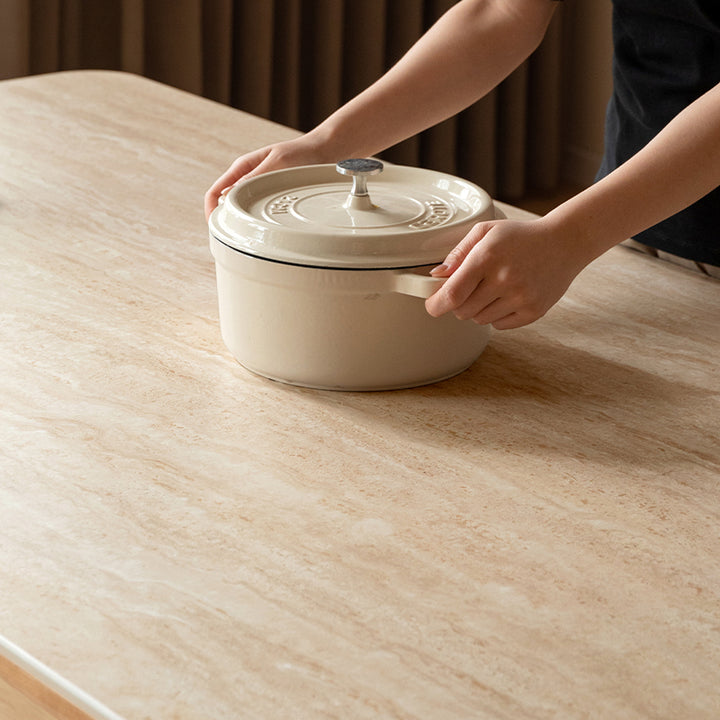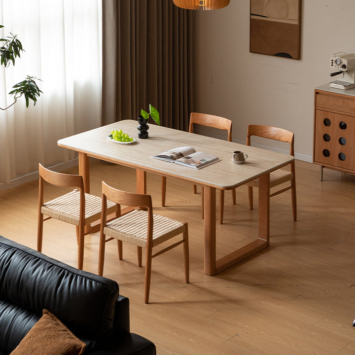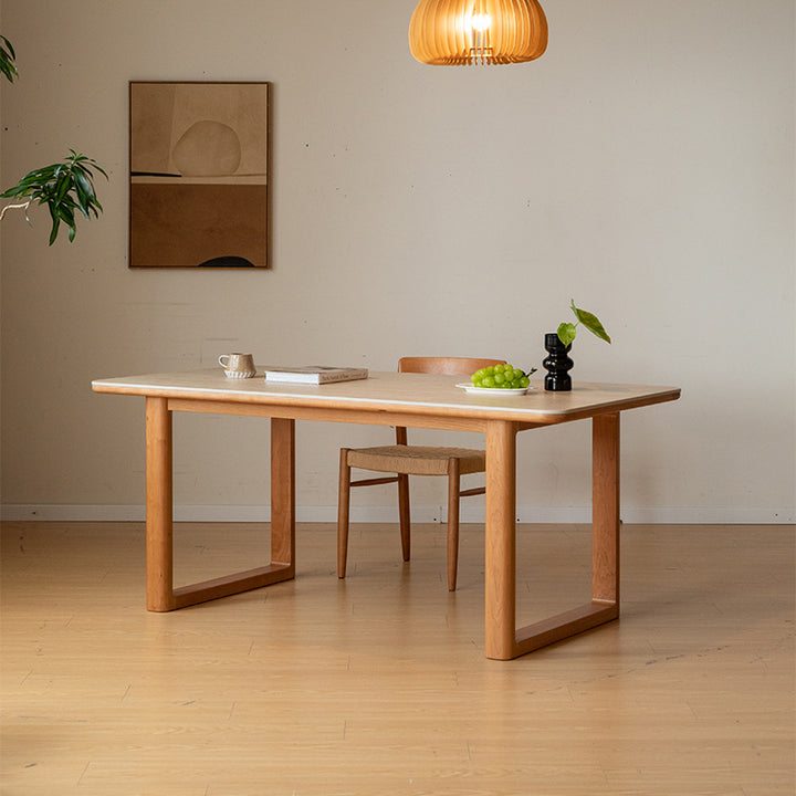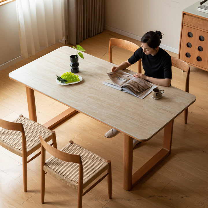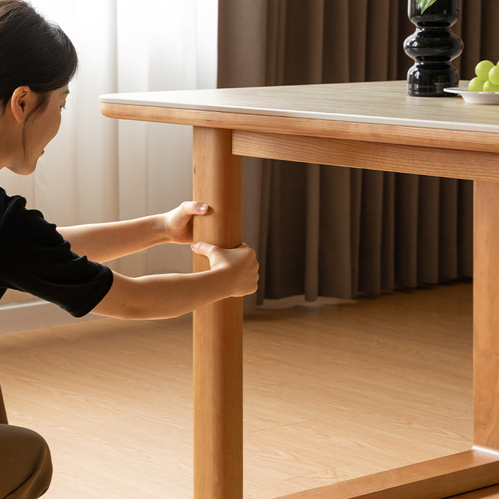 Gather in style around this exquisite dining table. It combines the warm, natural grain of solid cherry wood with the sleek durability of a rock slab top, resistant to heat, scratches, and stains. Perfect for both daily meals and special occasions, it's the heart of your home.