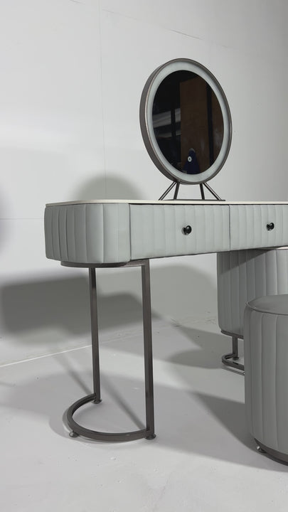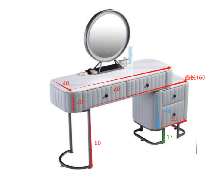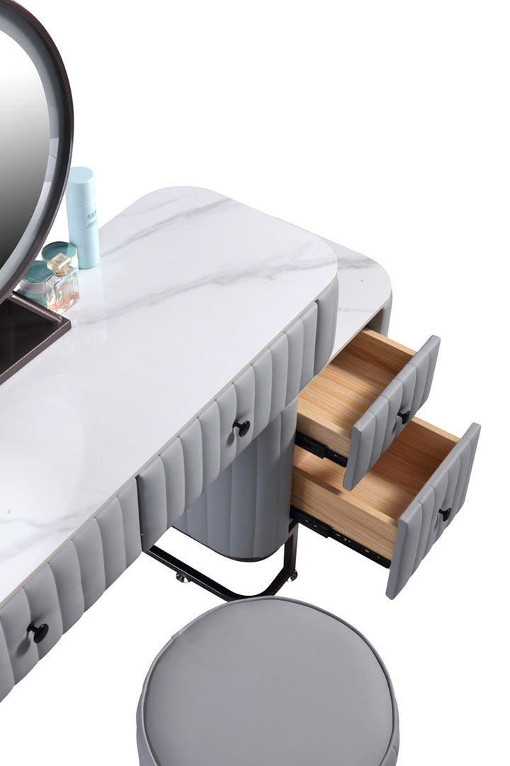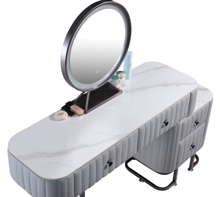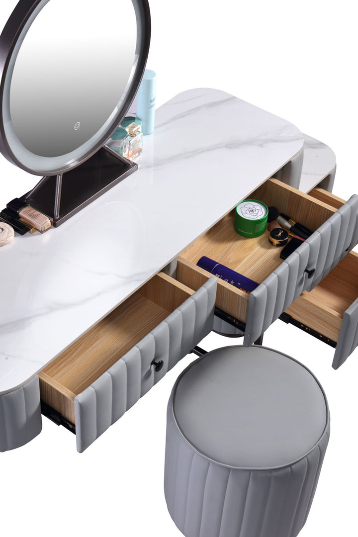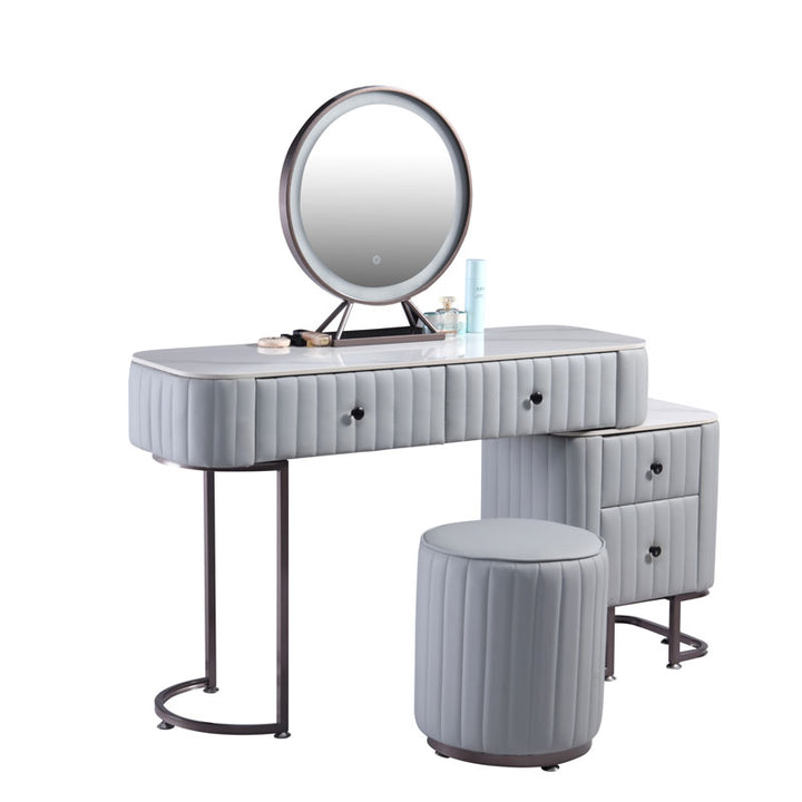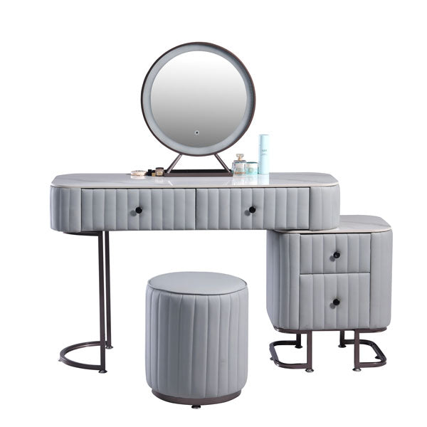 Introducing our Stone Top Vanity Table Set, featuring a slate stone tabletop with PU leather-wrapped side cabinets and layered drawers for organized storage. Supported by a sturdy metal frame, it includes a comfortable stool and a mirror with integrated lighting for optimal grooming. This set also features an additional storage cabinet, combining practical functionality with modern design for an enhanced grooming experience in any bedroom or dressing area!
